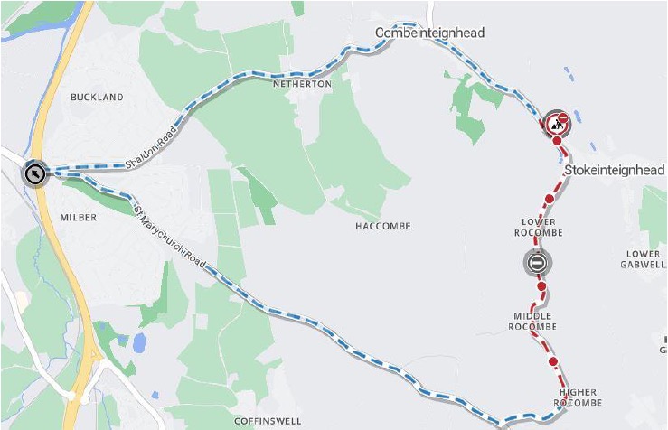 The alternative, signed, route for vehicles will be via – SHALDON ROAD, ROAD FROM